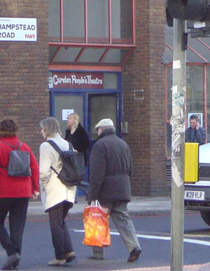 Ian Davidson (on mobile) and Zoë outside The Camden People's Theatre prior to the performance |