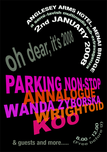Parking Non-Stop started off 2008 with their first ever home-town performance. In a special new year celebration, they played at the Anglesey Arms Hotel in Menai Bridge alongside specially invited guests Annalogue (the solo project of Ectogram's Ann Matthews), free-improv ensemble Koo, sculptor, performance artist and film-maker Wanda Zyborska and singer-songwriter Wrightoid. Wrightoid joined Parking Non-Stop on stage for a performance of his composition Yellow Blue, and poet Rhys Trimble joined them to perform his poem Aros. |