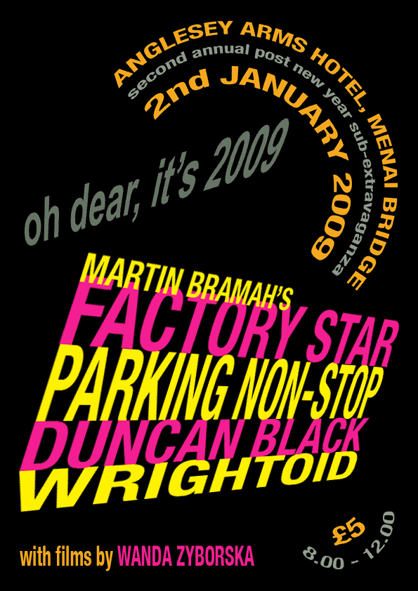 Parking Non-Stop started off 2009 with their second new year party. As in 2008, the event took place at the Anglesey Arms Hotel in Menai Bridge and this time their special guests were ex-Fall and Blue Orchids founder Martin Bramah's new group Factory Star, cosmic rock warriors Facefish, guitar wizard Duncan Black and a return appearance by their old friend Wrightoid. |