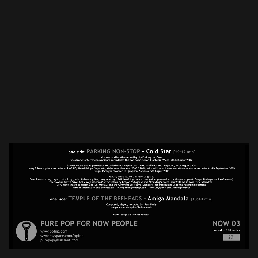 A split vinyl LP in a limited pressing of 100 copies, individually numbered and housed in handmade sleeves. One long track each by Parking Non-Stop and Cologne-based act Temple of the Beeheads. Parking Non-Stop's contribution 'Cold Star' uses recordings made in the RAF bomb depot, Llanberis, Wales on 9th February 2007 and in Dul Mayrau coal mine, Vinařice, Czech Republic on 16th August 2006 and features a guest appearance by the Slovenian poet Gregor Podlogar recorded in Ljubljana on 5th August 2008. |